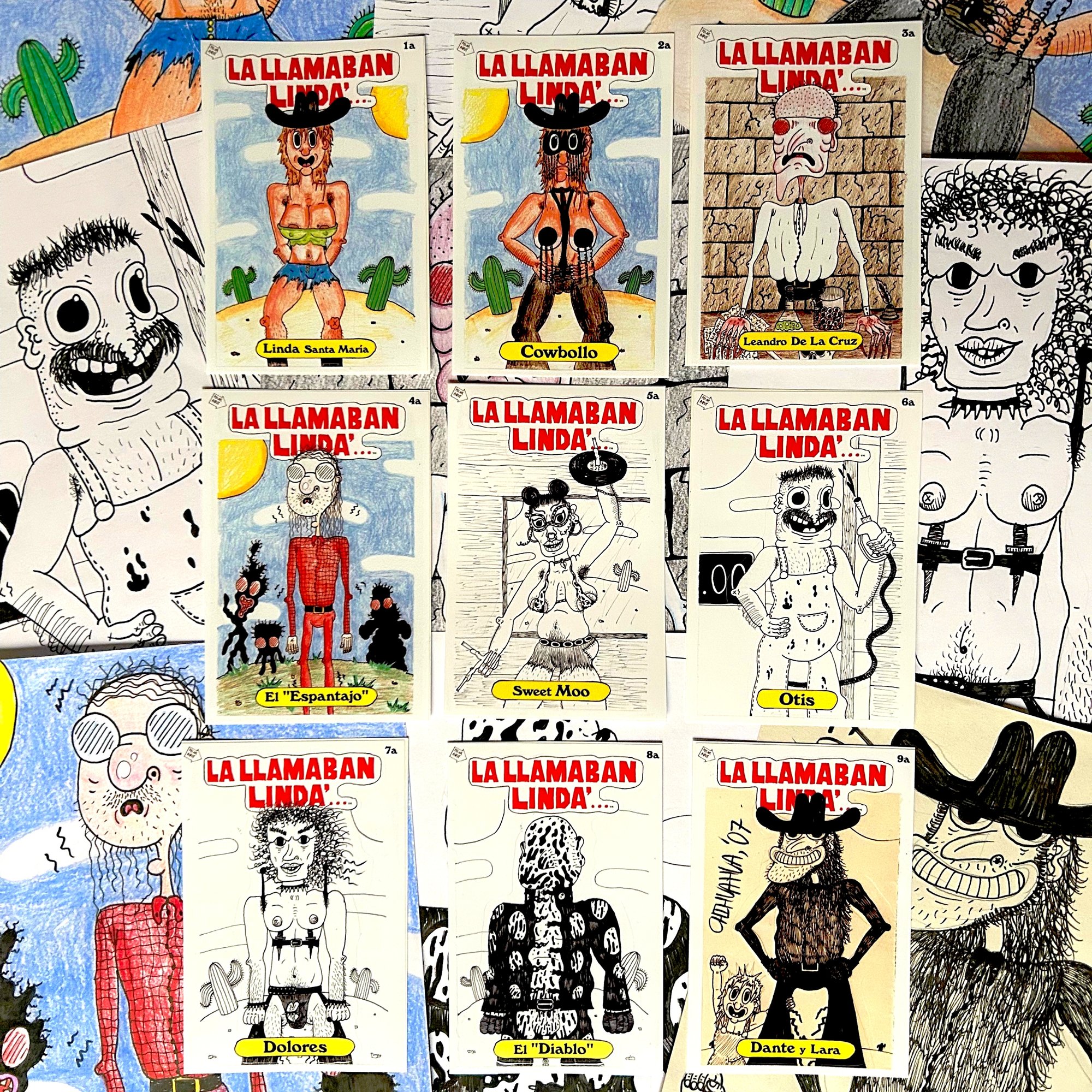 Una mini-colección con los personajes principales del próximo fanzine de Cowbollo: LA LLAMABAN LINDA'... El diseño está basado en la icónica serie de cromos Garbage Pail Kids, de los que también se podia desenganchar al personaje para usarlo como pegatina. Se trata de una tirada limitadísima de solo diez sets de la colección completa.